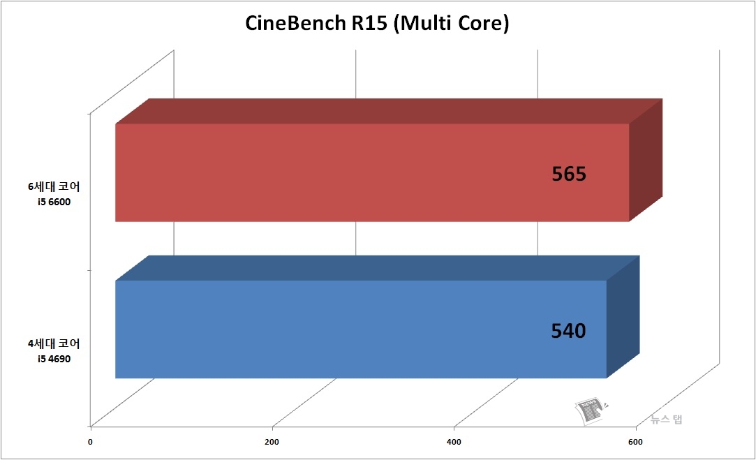 테스트 결과 인텔 6세대 코어 i5 6600가 이전 세대인 인텔 4세대 코어 i5 4690에 비해 약 5% 정도 높은 성능을 기록했다. 확실히 더 나아진 성능을 보여주기는 하지만, 더 많은 향상을 기대했던 유저들에게는 다소 실망스러울 수 있는 수치다. 다만 기본 작동속도가 인텔 4세대 코어 i5 4690이 3.5GHz로 0.2GHz 정도 더 빠르다는 것을 감안하면 크게 떨어지는 수치라 보기는 어려울 것이다.