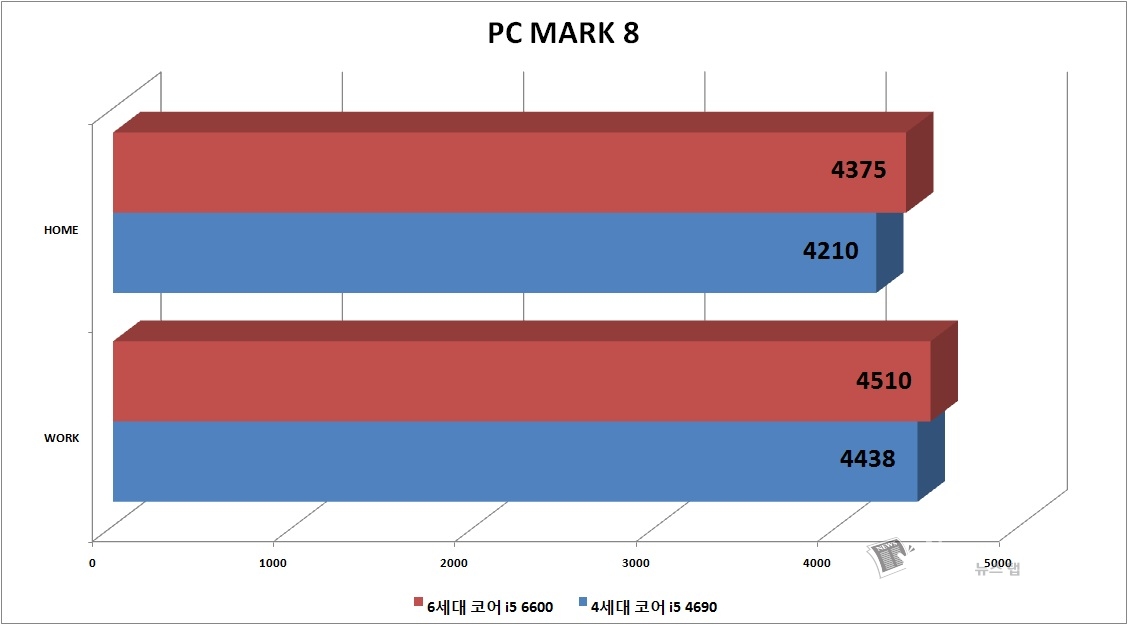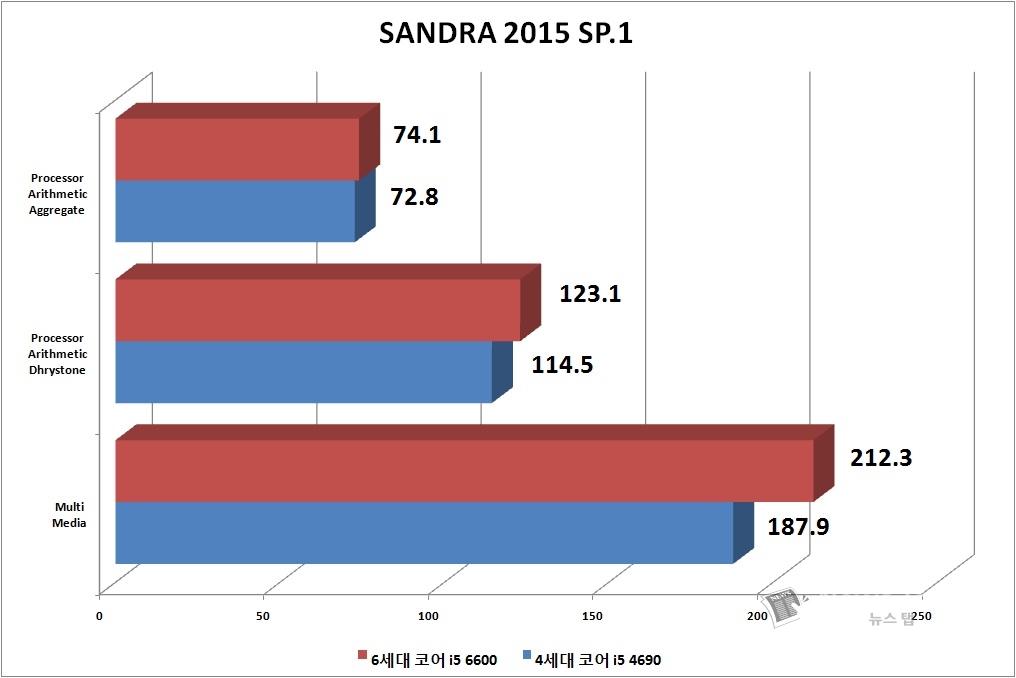 두 제품은 연산 능력에 있어서는 기대 만큼의 차이를 보여주지 못했다. 물론 인텔 6세대 코어 i5 6600의 성능이 더 뛰어나기는 했지만, 10%를 넘지 않아 생각보다 낮은 수치라 할 수 있다. 하지만 멀티미디어의 성능 측정 항목에서는 상당한 차이를 보여줬다. 클럭이나 쓰레드의 개수 등은 같지만 IPC당 효율을 개선하고, 메모리의 성능이 높아져 이같은 결과가 측정된 것으로 보인다.