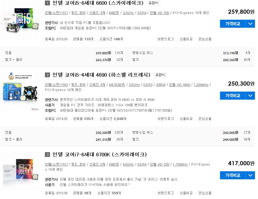 - CPU : 인텔 6세대 코어 i5 6600 / 인텔 4세대 코어 i5 4690