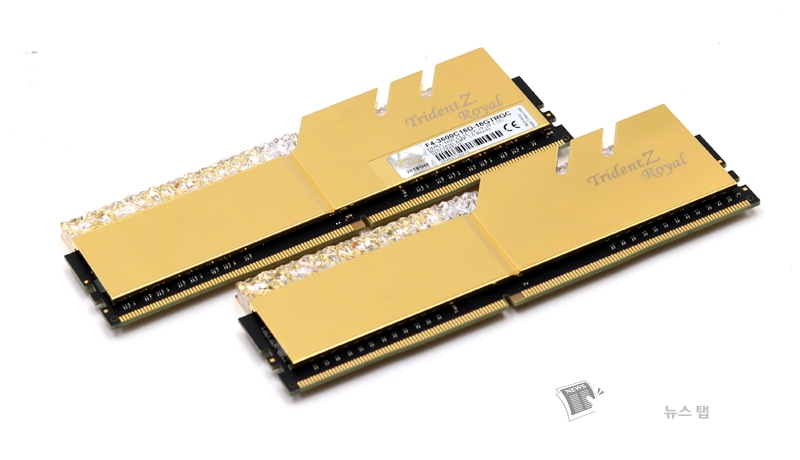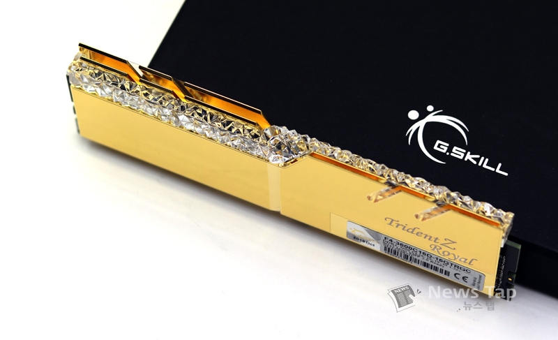 'G.SKILL DDR4 16G PC4-28800 CL16 TRIDENT Z ROYAL C 골드'는 공개와 동시에 세간의 화제를 몰고 왔던 트라이던트 Z 로얄 시리즈의 고클럭 제품으로 화려한 디자인과 영롱한 RGB LED의 조합이 마치 보석을 연상케 한다는 점에서 메모리 이상의 가치를 주기에 충분하다.