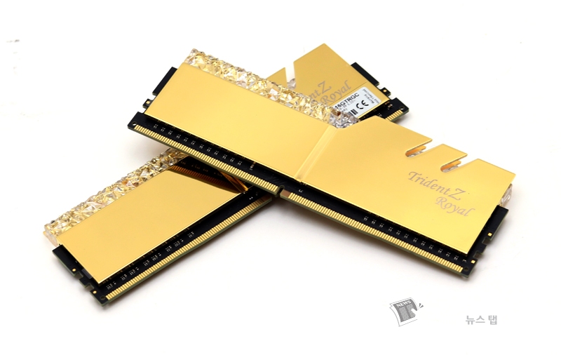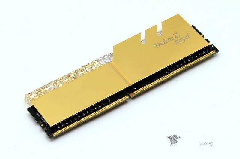 'G.SKILL DDR4 16G PC4-28800 CL16 TRIDENT Z ROYAL C 골드'를 처음 마주한 사람이라면 누구라도 '이게 과연 PC 메모리가 맞나?'라는 의구심을 가질 것이다. 존재만으로도 주변을 환히 밝히는 황금색 방열판과 값비싼 크리스탈을 연상시키는 LED 바의 조합은 PC 메모리의 범주를 뛰어넘는 고급스러운 자태를 뽐낸다.