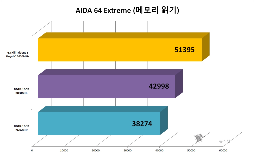 먼저 AIDA64 Extreme 프로그램의 메모리 읽기 테스트를 통해 'G.SKILL DDR4 16G PC4-28800 CL16 TRIDENT Z ROYAL C 골드'의 성능을 알아봤다. 그 결과 본 제품은 51395MB/s의 속도를 기록해 DDR4 3000MHz 제품과 2666MHz에 비해 높은 것으로 나타났다.