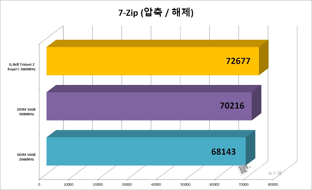 끝으로 'G.SKILL DDR4 16G PC4-28800 CL16 TRIDENT Z ROYAL C 골드'가 최근 출시된 AMD 3세대 라이젠 프로세서와 함께 사용했을 때 어느 정도의 능력을 보여주는지 알아봤다. 앞서 언급했듯 라이젠 3000 시리즈는 고클럭 메모리와 사용했을 때 성능 향상 폭이 무척 크다.