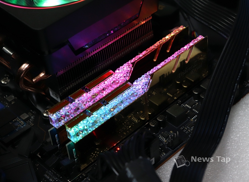 'G.SKILL DDR4 16G PC4-28800 CL16 TRIDENT Z ROYAL C 골드'의 가장 큰 장점이라면 역시 모델명에 걸맞는 화려한 RGB LED일 것이다. 전원이 인가됨과 동시에 크리스탈 바에 RGB LED가 점등되는데, 보석같은 외형에 어울리는 화려한 조명은 LED 쇼를 보는 듯 화려하기 그지없다.